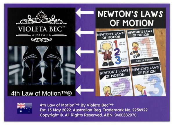 The 4th Law of Motion™® by Violeta Bec ™® is a Registered Australian Trademark (No.2261525), classed under Categories: 35 & 16 & 41 as per IP Australian Trademark Classification Standards.